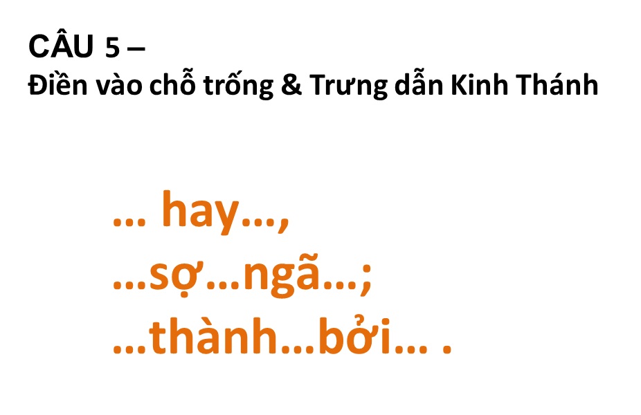 Xin kính mời các con cái Chúa trong và ngoài HT Vĩnh Phước, tham gia mục đố Kinh Thánh, mỗi tuần có 5 câu đố sẽ được đăng trên Website và Facebook vào lúc 12h00 thứ Hai hàng tuần, đáp án và kết quả sẽ được giải đáp trước khi đăng câu đố mới.
