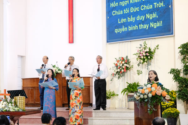 Sau lời cầu nguyện của ông Đặc trách Cao niên, tốp ca “Hãy đếm các ơn Phước Chúa ban” (Thánh ca 674) như lời nhắc nhở mỗi người nhìn lại những điều Chúa ban để hiệp lòng với Ban Cao niên cảm tạ Chúa. Trong tinh thần biết ơn,hội chúng cùng ca ngợi Chúa Thánh ca 678, tiếp theo là một đơn ca và một tốp ca nam thuộc mọi lứa tuổi được mời lên hiệp với các nam Cao niên dâng lời tạ ơn, tôn vinh Chúa Trưởng ban Cao niên, ông Huỳnh Hữu Sơn đã trình bày đôi nét sinh hoạt của Ban Cao niên và có lời cảm ơn các diễn giả đã góp phần trong năm qua.