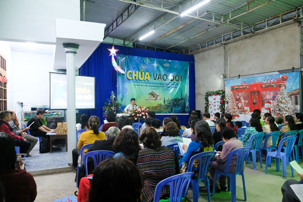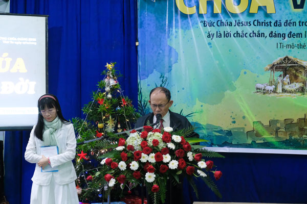 Cô Hoàng Anh hướng dẫn chương trình Mục sư Nguyễn Thanh Trà trình bày sứ điệp Giáng sinh với đề tài “CHÚA VÀO ĐỜI”, nương trên Kinh thánh I Ti-mô-thê 1:15 “Đức Chúa Giê-xu Christ đã đến thế gian để cứ vớt kẻ có tội, ấy là lời chắc chắn, đáng đem lòng tin trọn vẹn mà nhận lấy.” Chúa vào đời thấp hèn để chúng ta được vinh quang. Chúa vào đời nghèo để chúng ta được giào có. Chúa bằng lòng chết để cho chúng ta được sống. Ngài sẵn lòng bước vào vị trí của con người để cứu con người thoát khỏi sự chết đời đời.
