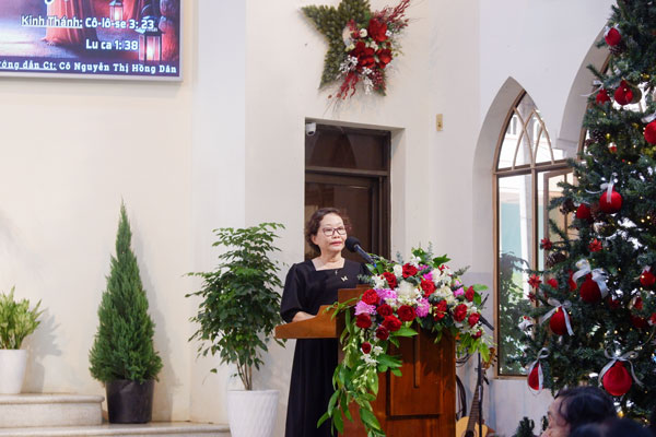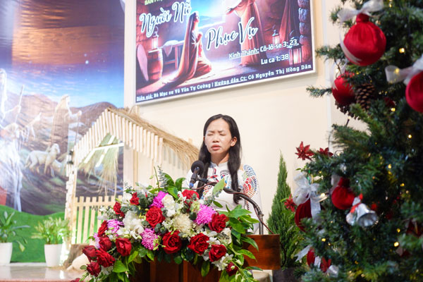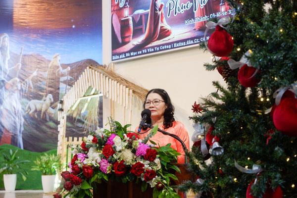 Cô Nguyễn Thị Hồng Dân – Trưởng ban Phụ nữ Vĩnh Phước hướng dẫn chương trình Phần ca ngợi Chúa đầu giờ đã đưa mọi người vào không khí ấm áp tươi vui của mùa Giáng sinh, lòng ngập tràn niềm vui trông đợi mùa Giáng sinh về.