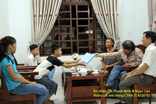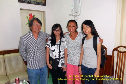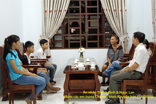Nhân dịp về thăm quê hương, ông bà Thanh Bình và Ngọc Lan - ân nhân của Chương trình Khuyến học - đã đến thăm Hội thánh Vĩnh Phước và trao đổi công tác khuyến học vào lúc 20g15' ngày 6/8/2015. Hiện diện gồm có Ms.Quản nhiệm, đại diện ban Trị sự, đại diện ban Khuyến học và các em học sinh đang được ông bà bảo trợ. Buổi gặp được diễn ra thật thân tình và nồng ấm.