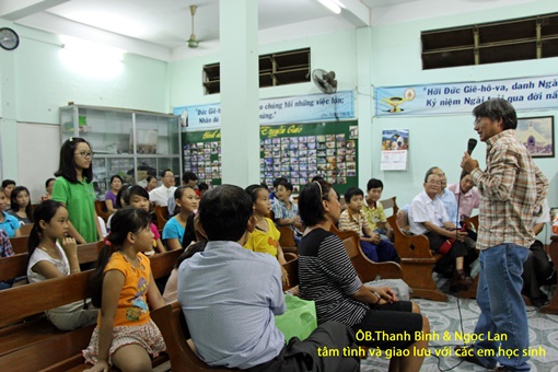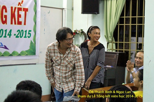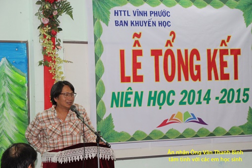 Sau đó, ông bà Thanh Bình và Ngọc Lan đã cùng tham dự Lễ Tổng kết niên học 2014-2015 và phát học bổng của ban Khuyến học HT Vĩnh Phước. Trong tinh thần yêu thương và gần gủi, ông Thanh Bình đã có lời tâm tình và giao lưu cùng các em học sinh để khích lệ động viên các em thêm lên lòng yêu mến Chúa, cố gắng học tập.