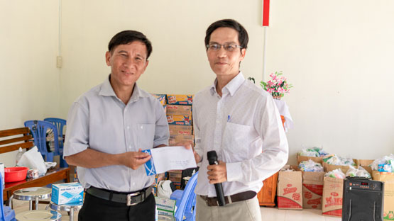 Đặc trách Thanh niên trao tiền hỗ trợ cho Ms. Hà Nghen phụ trách điểm nhóm sửa lại mái che