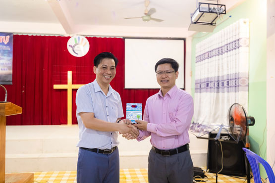 Ms. Quản nhiệm trao quà cho Trưởng đoàn huấn luyện Truyền giáo Hoàng Đình Nhật Quang