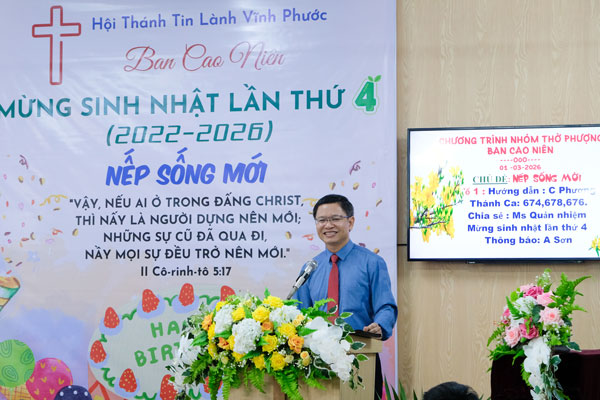 Sau đó, Mục sư Nguyễn Công Nghĩa, Quản nhiệm hội thánh đã cầu nguyện đặc biệt cho Ban Cao niên. Trong dịp nầy, Mục sư cũng đã dùng lời Chúa trong Giô suê 13:1-7 để khích lệ quý ông bà ở lứa tuổi Cao niên nắm lấy lời hứa trong Giô suê 1:3 mà hết lòng trung tín, tiếp tục phục vụ với lòng biết ơn Chúa về những việc Ngài đã làm trong cuộc đời mình suốt những năm tháng qua. Ống cũng nhắc nhở thế hệ nối tiếp cần theo gương các bậc Cao niên để đứng lên và bước tới trong linh trình.