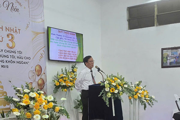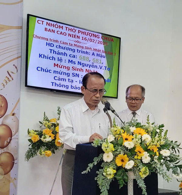 Mục sư Nguyễn Văn Tơ dùng Lời Chúa trong II Sa-mu-ên 19:31-40 với chủ đề “Quỹ thời gian” nhằm khích lệ quý vị Cao niên tận dụng quỹ thời gian còn lại của mình để phục vụ Chúa, và tạo điều kiện cho thế hệ kế thừa có cơ hội hầu việc Ngài . Sau lời cầu nguyện đáp ứng của ông Nguyễn Hoàng Thông, phần cắt bánh Sinh Nhật và chúc mừng diễn ra sôi nổi và vô cùng hào hứng với những bài thơ chúc mừng nhiệt thành của người dự.