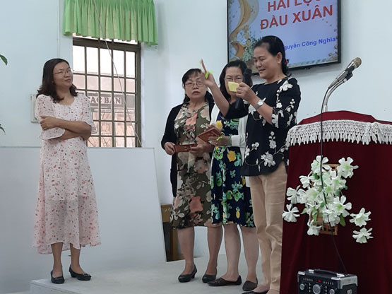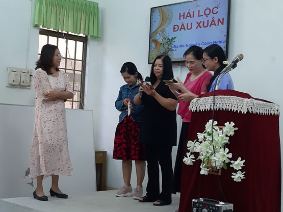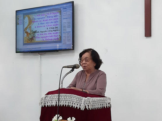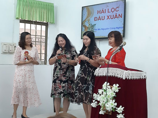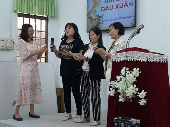 Giờ nhóm bắt đầu lúc 14h30 do cô Trưởng ban hướng dẫn, cô Phương Hạnh đã cho mọi người hát một bài Xuân mới cùng sự góp phần tôn vinh Chúa của các cô khiến cho giờ thờ phượng mang đầy không khí Xuân - mùa của sự hát xướng.