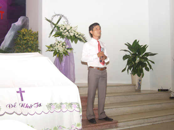 Mục sư Quản nhiệm chia sẻ Lời Chúa, nhấn mạnh sự vâng phục cho đến chết của Chúa Giê-xu, qua đó nhắc nhở Hội thánh suy niệm lại tình yêu tuyệt vời của Chúa Giê-xu dành cho mình và sống xứng đáng với tình yêu đó.