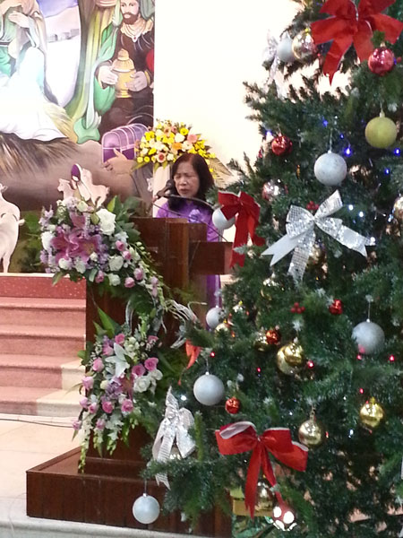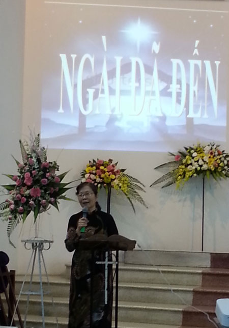 Với chủ đề “Ngài Đã Đến”, Kinh Thánh trong I Giăng 4:9, Phu nhân Mục sư Nhiệm Chức Nguyễn Đình Tín khích lệ chị em nữ giới hãy suy niệm về Đấng Giáng Sinh và những hy sinh lớn lao Ngài chịu để cứu chúng ta. Vì thế, chị em hãy cùng noi gương Ma-ri sẵn lòng thuận phục ý muốn Chúa để đem phước hạnh của Ngài đến với gia đình và những người chung quanh.