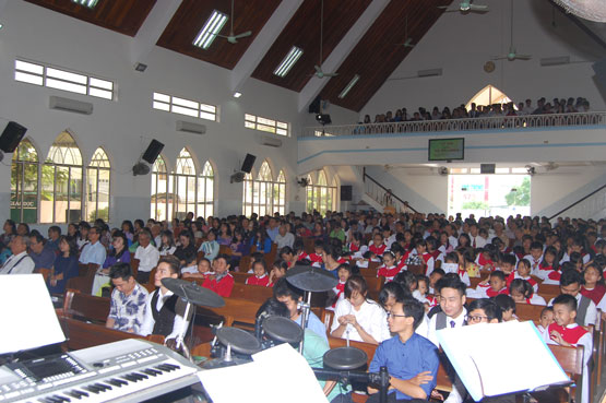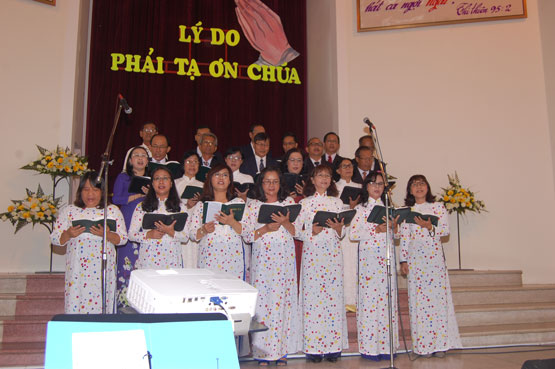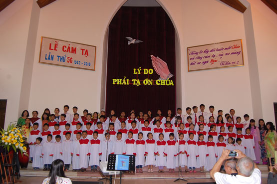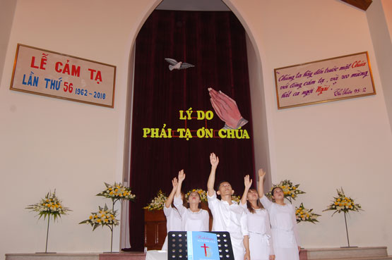 Các ban hát trong Hội Thánh tôn vinh Chúa cách rập ràng, mạnh mẽ. Sau buổi lễ cảm tạ, Hội Thánh cho thì giờ cho tôi con Chúa thông công vui vẻ.