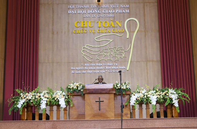 Vào lúc 8h00 ngày 4/7/2018, Đại HĐGP bước sang ngày làm việc thứ ba để bầu ra Tân HĐGP nhiệm kỳ 2018 – 2020. MS Nguyễn Văn Ngọc – Phó Tổng Thủ quỹ TLH hướng dẫn chương trình.
