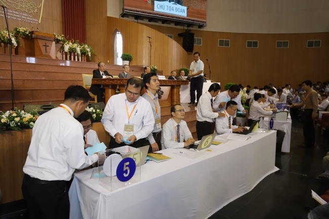 Phiên bầu cử được thực hiện dưới sự điều khiển của Chủ Toạ Đoàn gồm: MS Thái Phước Trường – Hội trưởng; MS Mã Phúc Hiệp – Chủ tịch HĐGP; MS Phan Vĩnh Cự – Phó Hội trưởng I, được đại hội tín nhiệm bổ sung vào Chủ Toạ Đoàn. Các đại biểu chính thức tiến hành bầu cử từng chức danh trong HĐGP. Tạ ơn Chúa, tất cả các chức danh trong HĐGP đều được đề cử và tín nhiệm quá bán ngay trong đợt bỏ phiếu đầu tiên cho mỗi chức danh, cụ thể như sau: