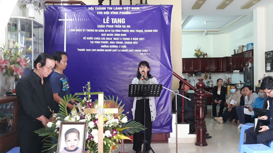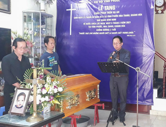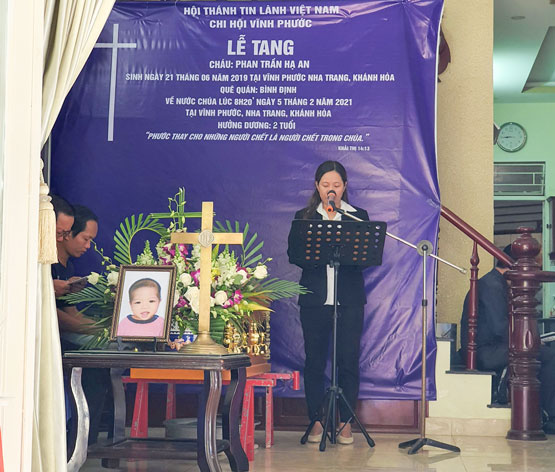 Cháu Phan Trần Hạ An sinh ngày 21 tháng 06 năm 2019 tại Nha Trang, là con của gia đình anh chị Phan Xuân Đoàn, thành viên của HTTL Vĩnh Phước đã về yên nghỉ nước Chúa lúc 8h20 ngày 05/2/2021, hưởng dương 02 tuổi.