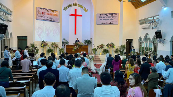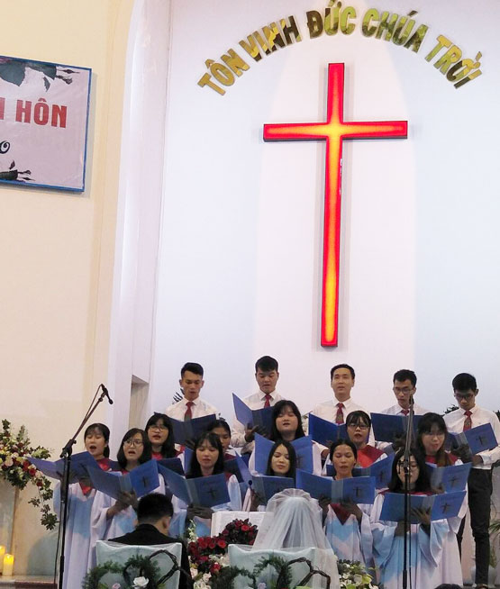Chấp sự Đỗ Minh Khánh hướng dẫn thờ Phượng và chương trình hôn lễ. Truyền đạo Phan Thanh Quang, Phụ tá Quản nhiệm Hội Thánh Nha Trang có lời Chúa cho Hội Thánh, cũng như cho hai bạn trẻ với chủ đề: "Trở nên một", dựa trên nền tảng Kinh Thánh Sáng-thế-ký 2: 18-25; Truyền đạo 4:12- Ê-phê-sô 5:21. Hai bạn tuy hai giờ trở nên nên một trước sự kết hiệp của Chúa, vì thế, người nam phải lìa cha mẹ mà dính díu cùng vợ mình. Tình yêu Cứu Chúa gắn kết hai bạn như một sợi dây bện ba lấy làm khó đứt, khi hai bạn xây dựng hôn nhân của mình trên Lời của Đức Chúa Trời và tôn Chúa làm chủ của gia đình mình.