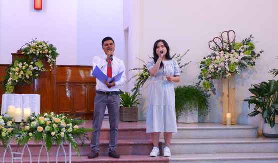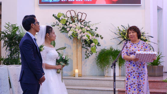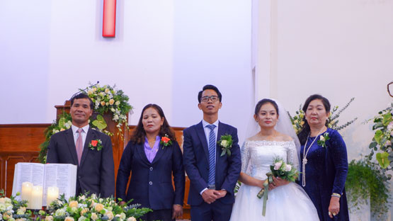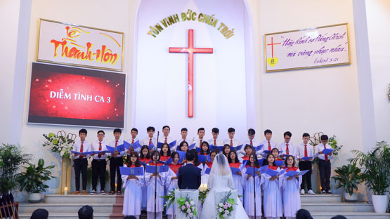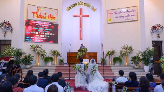 Mục sư Quản nhiệm Nguyễn Công Nghĩa làm chủ lễ. Cô Uỷ viên Lưu Bảo Trân hướng dẫn chương trình. Mục sư Nguyễn Văn Tơ, Quản nhiệm Chi Hội Vĩnh Lương có Lời Chúa cho Hội Thánh và đặc biệt cho hai bạn với chủ đề: Người Lê-vi cưới người Lê-vi: hôn nhân Thánh. Dựa trên nền tảng Kinh Thánh: Xuất Ê-díp-tô ký 2: 1, Lời Chúa dạy các bạn trẻ: Cơ đốc nhân phải cưới một Cơ Đốc nhân. Và thật phước hạnh biết bao khi cùng nhau phục vụ Chúa. Thầy cô đã yêu nhau và đã hứa dâng trọn đời sống mình hầu việc Chúa. Sau khi kết hôn, thầy cô sẽ vào Viện Thánh Kinh Thần Học học năm cuối, để trang bị cho chức vụ tương lai của mình. Gia đình nào hầu việc Đức Giê-hô-va, thật có phước thay! Trong hôn lễ cũng có các bài hát tôn vinh Chúa, những món quà mừng từ các Hội Thánh và ban ngành, và cũng không thiếu những điện tín chúc mừng từ nơi xa.